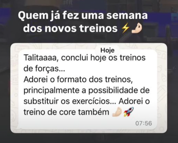 Treinos de força que duram no máximo 60 minutos, vídeos disponíveis na plataforma para você executar cada exercício com a técnica correta, e, a assessoria da Personal Talita Cagnoni pelo Instagram fechado.
